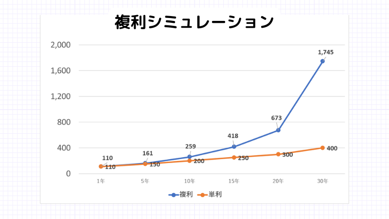 たとえば100万円を年率10%で運用した場合、利益を再投資しない単利計算では30年後に400万円になりますが、複利計算では約1,745万円になりその差は1,345万円にもなります。
