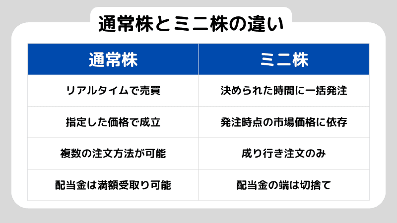 ミニ株と通常株は、同じ株式取引でも仕組みや取引ルールが大きく異なります。