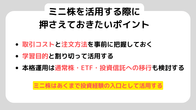 ミニ株は、株の仕組みを体験しながら学ぶためのツールとして使うのが効果的です。