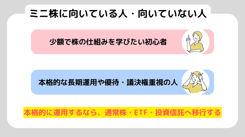 ミニ株は「少額で株式投資を体験したい人」には向いていますが、本格的な資産形成を目的とする人には不向きです。