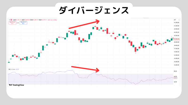 たとえば、株価が高値を更新しているにもかかわらずRSIが前回の高値を更新しない場合、トレンド転換の兆候として注目されます。