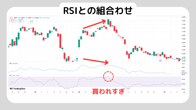 たとえば、価格とOBVに弱気のダイバージェンスが見られているところで、オシレーター系指標であるRSIが買われ過ぎ圏内にあるとしましょう。