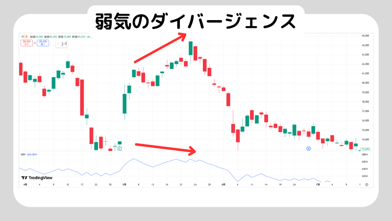 弱気のダイバージェンスは、価格が高値を更新し続けているのにOBVが前回の高値を超えられず下降している状態を指します。