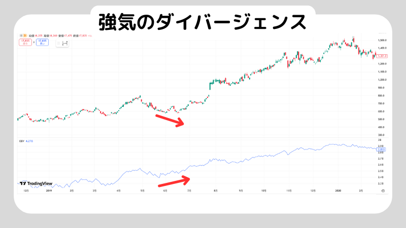 一方、強気のダイバージェンスは逆のパターンで、価格が安値を更新しているにもかかわらずOBVが上昇している状態を指します。