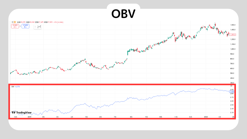 OBVは価格上昇日の出来高を加算し、下落日の出来高を減算する累積指標で、買い圧力と売り圧力のバランスを可視化できます。